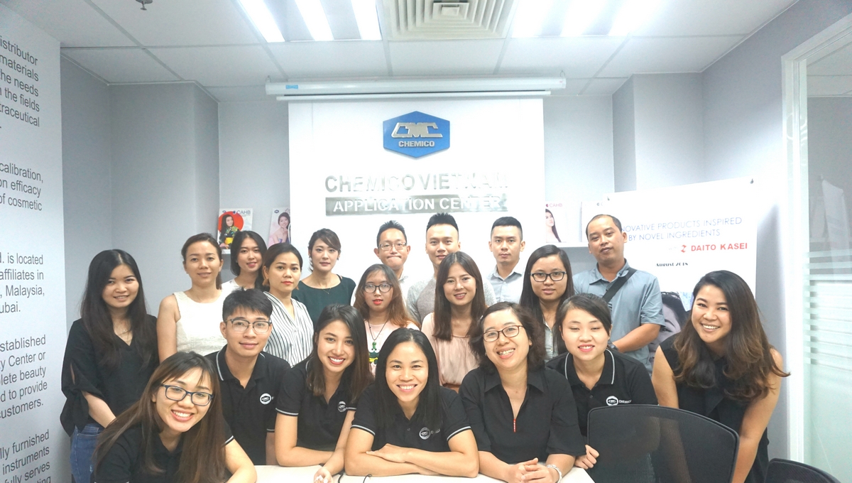 Daito Kasei in collaboration with Chemico Vietnam Co., Ltd. held an Mini Seminar titled “Innovative Products Inspired by Novel Ingredients” on August 7 and 8, 2018 at Chemico Vietnam Application Center, Vietnam. The seminar introduced the innovative make up products, ingredients for makeup & skin care from Daito & new definition of application SFL-treatment. The Yogurt Touch Body Cream, Souffle Like 2Way Powder Foundation – Binder Free & Non-Transfer Lipgloss are also included in the workshop.