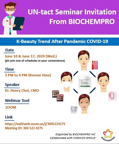 Biochempro Incorporation in collaboration with PT. Kemiko Indonesia held the webinars entitled “K-Beauty Trend After Pandemic COVID-19” on June 10 and 17, 2020 with Dr. Henry Choi as the main speaker. The participants included the customers in Thailand, Malaysia and the Philippines. The webinar focused on the economic impacts, new lifestyle and how the K-beauty trends change during this pandemic situation in South Korea. The most noticeable consumer behavior change was the rise of un-tact (un + contact) marketing which was supported by online shopping technology. Meanwhile, the demand in beauty care was dominated by skin care and cleansing products. The seminar ended by Biochempro product recommendation for anti-bacterial, trouble-care, tone-up and skin recovery active ingredients.