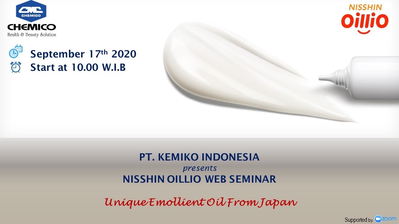 The Nisshin OilliO Group, Ltd. collaborated with PT. Kemiko Indonesia, Jakarta Indonesia had done a webinar on September 17th, 2020. The topic was about “Unique Emollient Oil from Japan”. The webinar presented Nisshin Oillio products used in skin care products including the ester range from light to heavy esters.