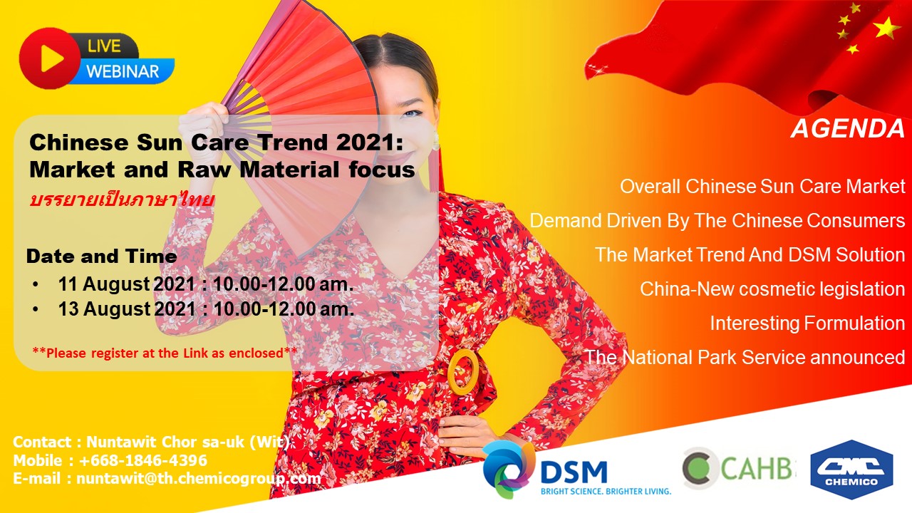 Chemico Inter Corporation Co., Ltd. held webinars on August 11 and 13, 2021 under the same topic "Chinese Sun Care Trend 2021: Market and Raw Material Focus" created by DSM Nutritional Products (Personal Care). The webinar focused on market trends and DSM solutions as well as interesting formulations.