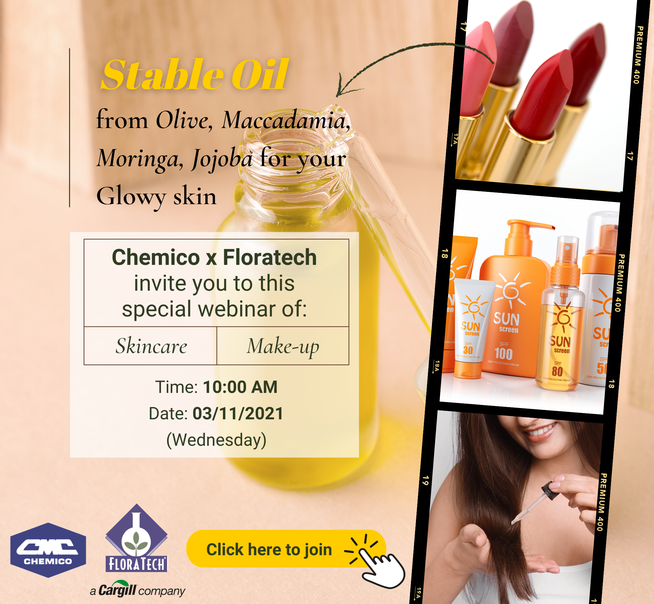 Formulating with natural oil is not a new concept in cosmetics or beauty products. However, choosing a stable ingredient for your natural or plant-based product from numerous source is a difficult solution for many manufacturers. Understanding this, Chemico Vietnam Co., Ltd. in collaboration with Floratech – a famous supplier with many high quality and unique plant-derived oils from USA, held a webinar on November 03rd, 2021 with the topic “Optimal Selection for Skincare and Makeup”. Through the time of webinar, all attendees were updated on the new trends as well as shared the outstanding efficiency of olive, macadamia, moringa and jojoba oil from Floratech in skincare and makeup products. Please do not hesitate to contact us and try the successful prototypes shown during the webinar which were developed by Chemico Vietnam Application team.
