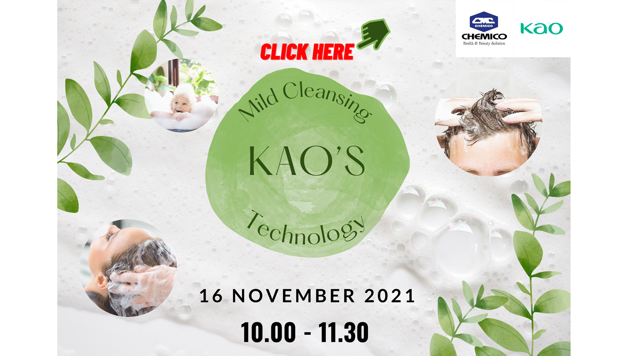 Kao Industrial (Thailand) Co., Ltd. in collaboration with Chemico Inter Corporation Co., Ltd. held a customer webinar on November 16, 2021. Inspired by the topic "KAO's Mild Cleansing Technology”, Kao introduced 2 concepts and the related ingredients. The first one was anti-hair loss shampoo with 90 % natural, moisture-lock and sebum control to solve hair loss problem from the stress of COVID-19 pandemic. And, another concept was high speed make up cleanser with new texture. The webinar presented several formulation guidelines of facial and hand cleansers as well as performances of products.