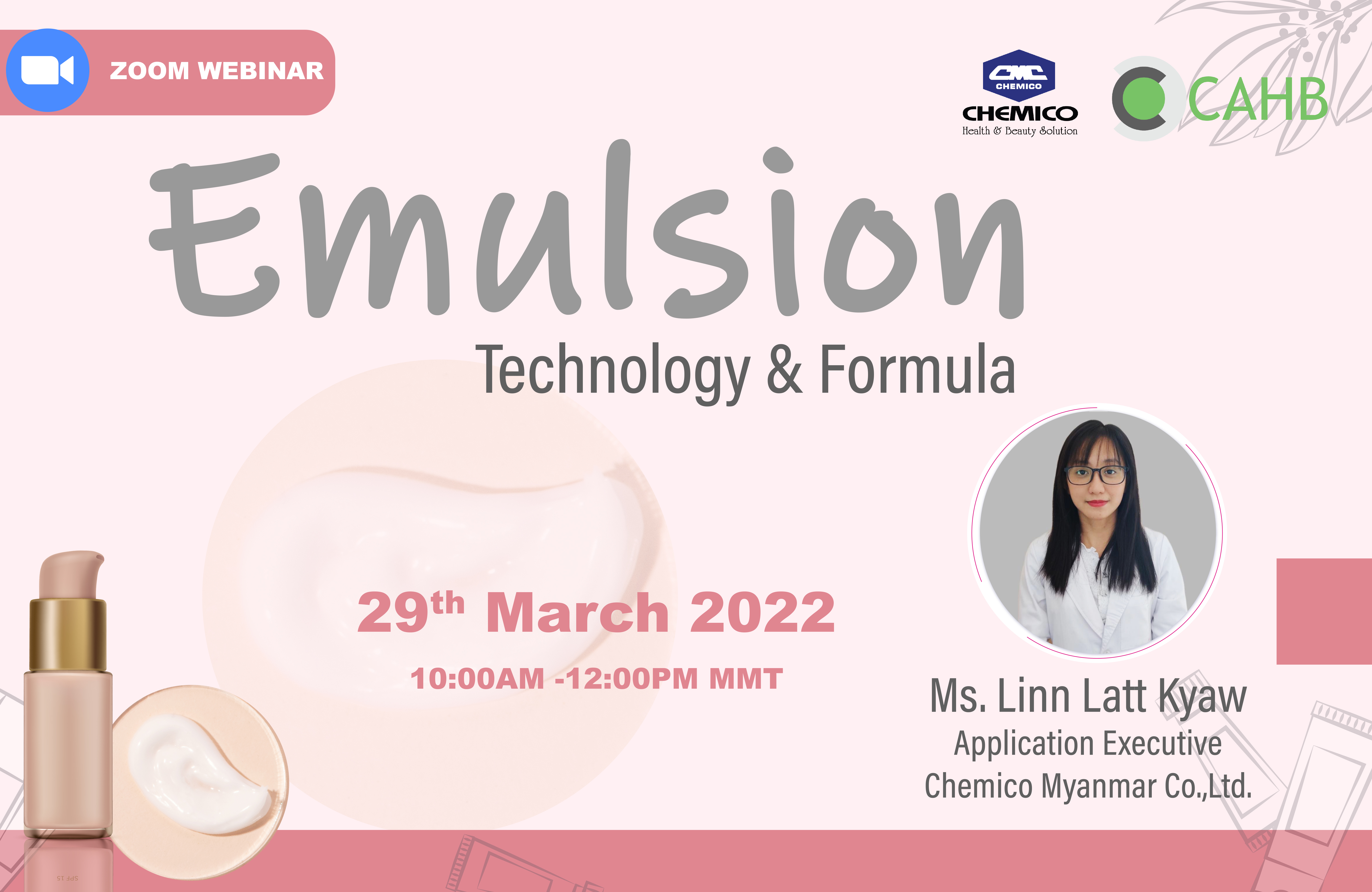 Chemico Myanmar Co., Ltd. held an interesting webinar entitled “Emulsion Technology & Formula” on March 29, 2022. The application team presented about Emulsion Technology during the webinar. Various types of emulsifiers, the related ingredients and examples of formulations were also included. Participants were interested in stability and microbiological test services as well and requested for service information as well as raw material samples and prototype samples.