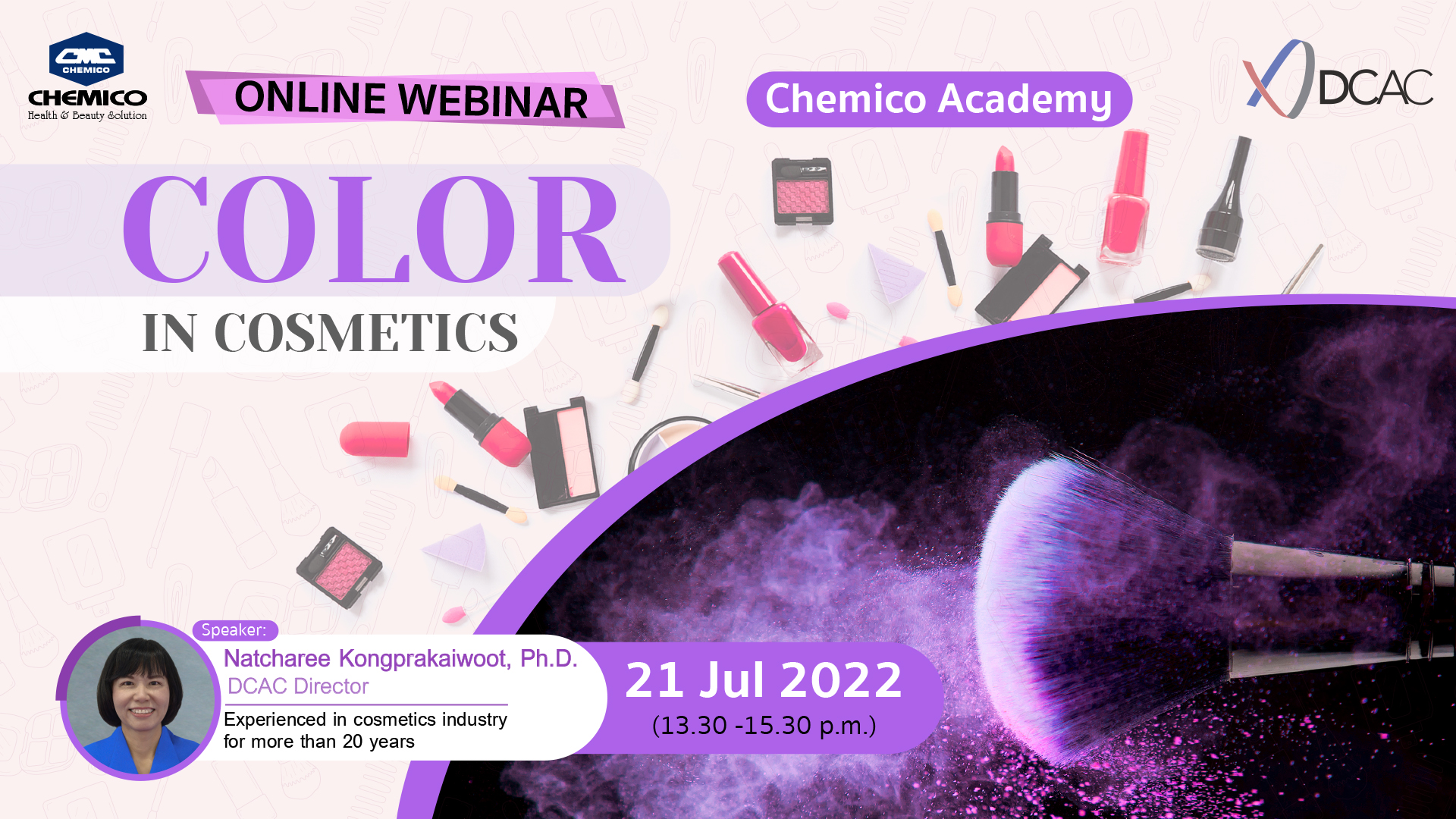 Daito Chemico Asia Color Cosmetics (DCAC) Center, a member of Chemico group, Thailand held a webinar for Academy entitled "Color in Cosmetics" on July 21, 2022.  Attendants were lecturers, professors and students. Color theory, Type of colorant, Factor affecting color and Color matching were presented during the webinar.
