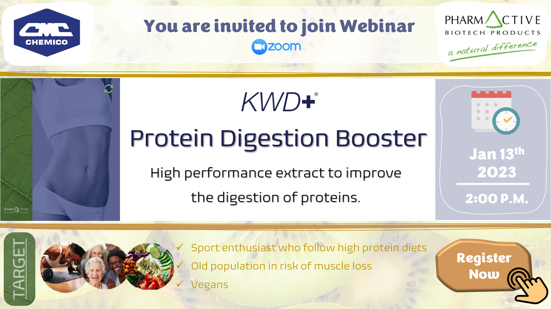 Pharmactive Biotech Products, S.L., Spain in collaboration with Chemico Inter Corporation Co., Ltd., Thailand organized a webinar entitled “High Performance Extract to Improve the Digestion of Proteins” on January 13th, 2023. The webinar provided the protein requirement information in each group, KWD+®’s bioactive compounds, scientific evidence for protein digestion and absorption, market products as well as solubility test and applications. The information is very useful in the development of new products in the field of dietary supplements (hard capsule, tablet, beverage, powder shot, etc.).