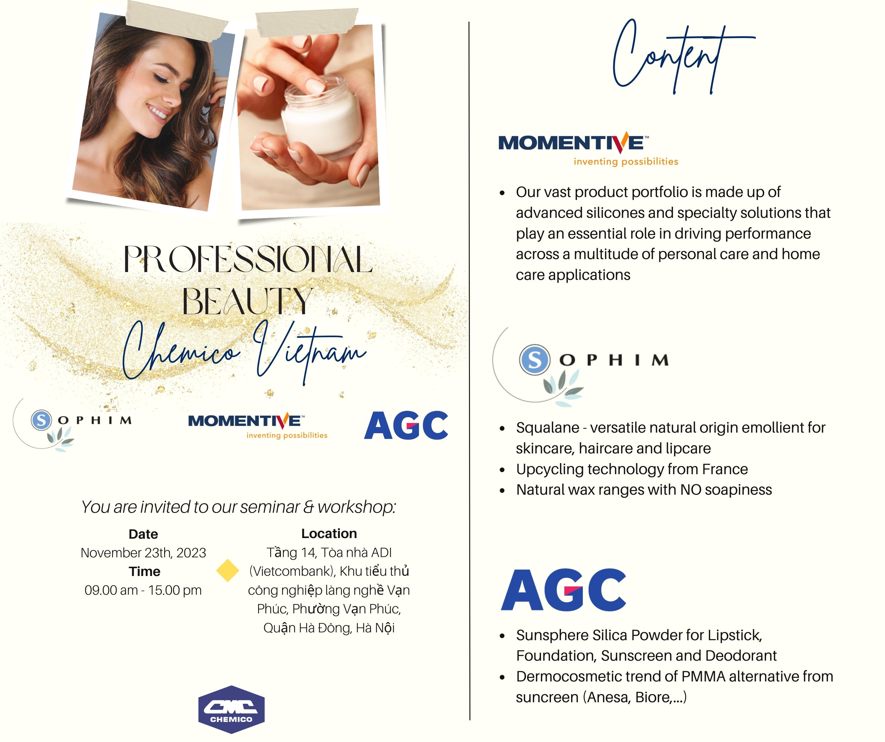 On November 23rd, 2023 AGC Si-Tech Co., Ltd., Momentive Performance Materials Inc. and Sophim in collaboration with Chemico Vietnam Co., Ltd., held a very first PROFESSIONAL BEAUTY Seminar 2023 at the new facility in Hanoi. Inspired by the topic, the 3 suppliers took this chance to introduce their key ingredients hopefully to evoke the inner beauty - from sun care to make up and hair care. All were about silica from AGC – Japan, Squalane & natural wax from Sophim – France and silicone from Momentive – USA. After the theory part, all participants joined the workshop part to do the interesting formulations using Chemico Vietnam Application team’s guidelines.