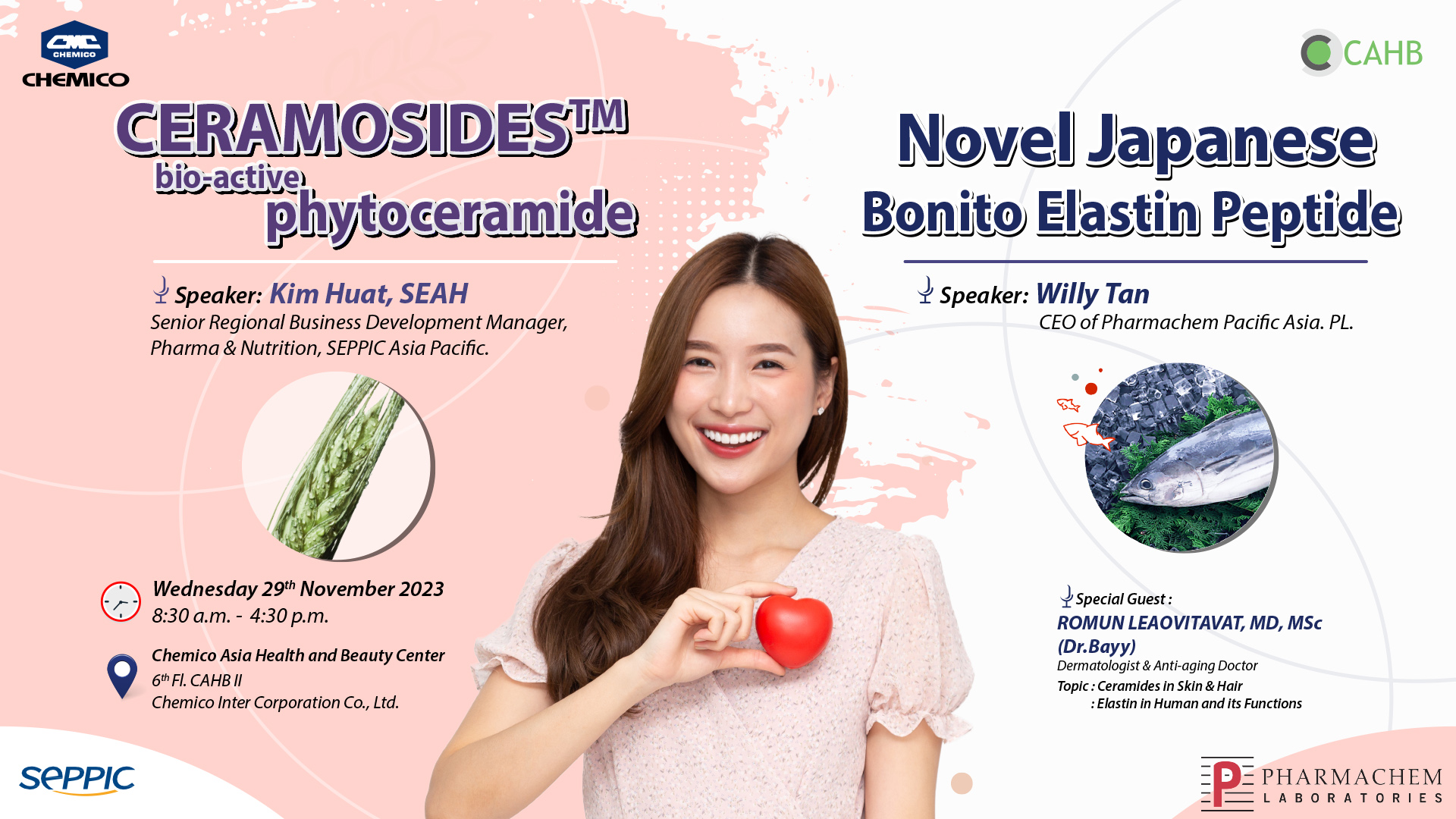 Seppic S.A., France and Pharmachem Pacific Asia. Pte. Ltd., Singapore in collaboration with Chemico Inter Corporation Co., Ltd., Thailand organized a seminar entitled “Novel Japanese Bonito Elastin Peptide with French CERAMOSIDES™ Bio-Active Phytoceramide” on November 29th, 2023 at Chemico Asia Health and Beauty (CAHB) center, Thailand. The seminar provided basic knowledge (ceramide in skin & hair, elastin in human and its function), product information (Ceramosides™, Bonito Elastin Peptide), clinical studies, regulatory information, market products and formulations as well as tasters. The information is very useful in the development of new products in the field of dietary supplement products (hard capsule, soft gel, tablet, powder shot, jelly strip, gummy jelly, beverage).