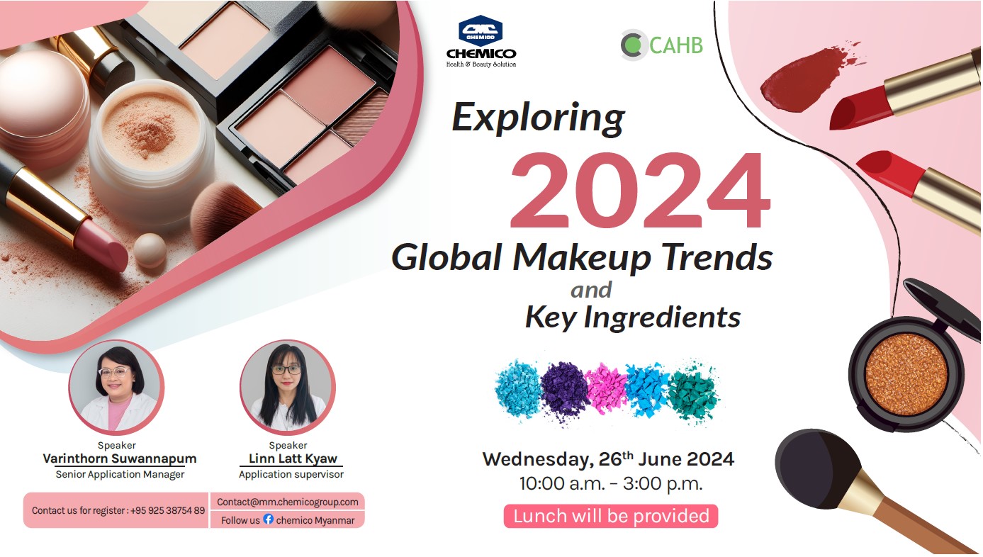 Chemico Myanmar Co., Ltd. in collaboration with Chemico Asia Health and Beauty (CAHB) center, Bangkok, Thailand organized an interesting seminar on June 26th, 2024 at Chemico Myanmar Application center. The topic was “Exploring 2024 Global Makeup Trends and Key Ingredients.” The seminar presented about Global makeup tends 2024 and the related makeup formulations. Key ingredients of the presented formulas were also included. The theory part was followed by workshop section where the customers could do the trial of those formulations.