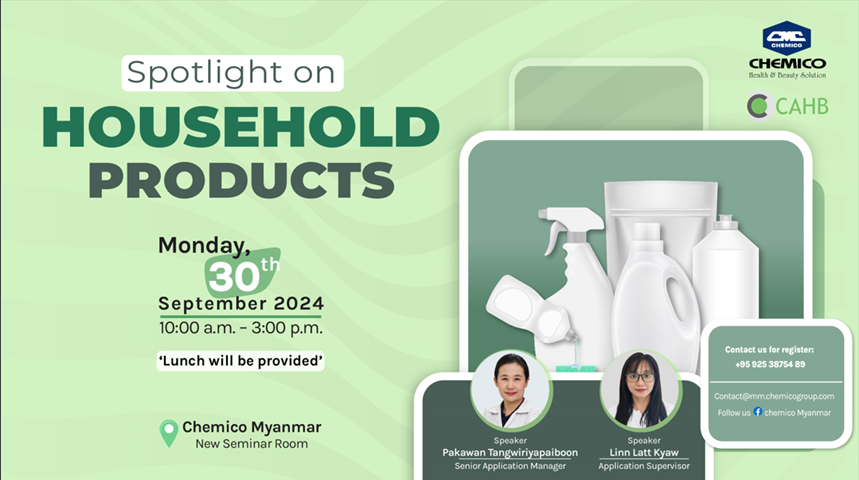Chemico Myanmar Co., Ltd. organized an interesting Homecare seminar on September 30th, 2024 at Chemico Myanmar Seminar Room. The topic was “Spotlights on Household Products”. In the theory session, the seminar presented about how to make homecare products. And, the customers had a chance to prepare the related formulations in the lab practice.