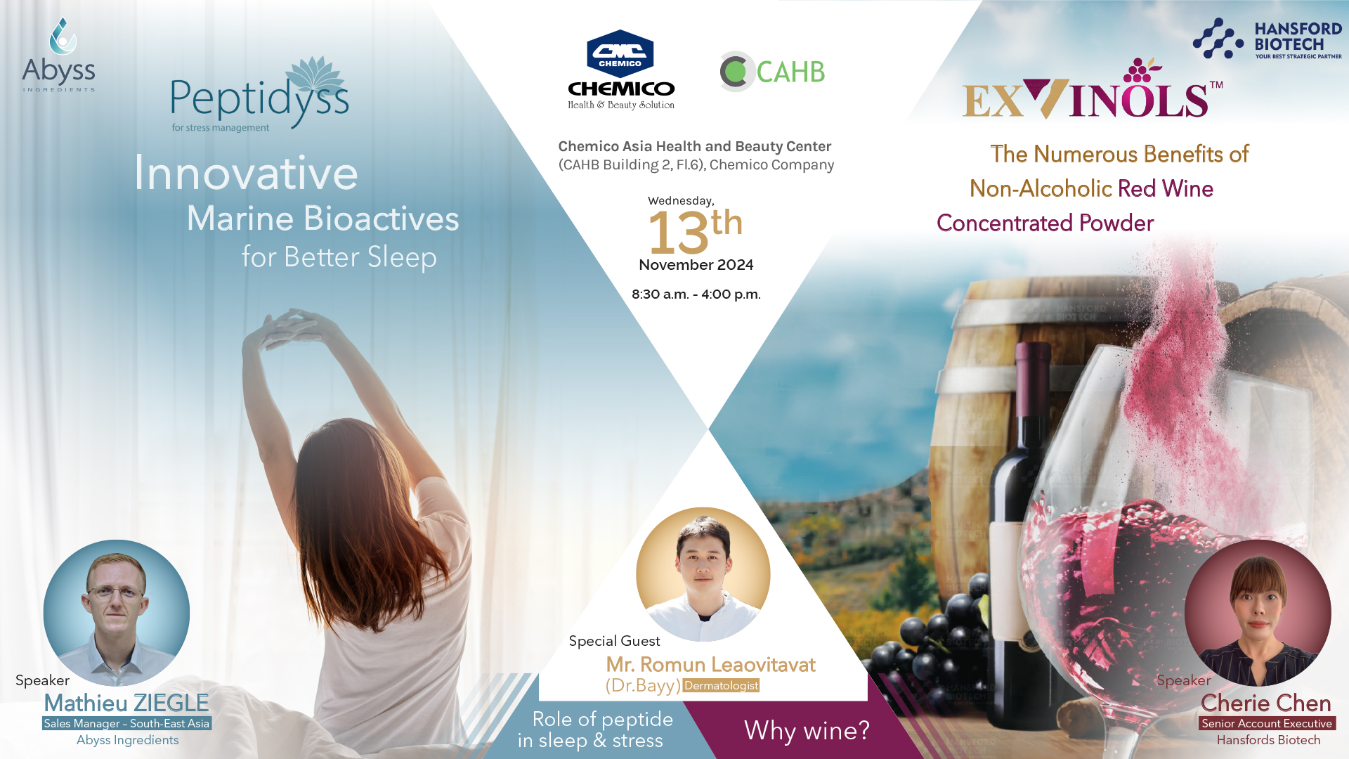 Abyss Ingredients, France and Hansford Biotech Co., Ltd., Taiwan, in collaboration with Chemico Inter Corporation Co., Ltd., Thailand organized a seminar entitled “Innovative Marine Bioactive for Better Sleep and ExVinolsTM: The Numerous Benefits of Non-Alcoholic Red Wine Concentrated Powder” on November 13th, 2024 at Chemico Asia Health and Beauty (CAHB) center, Thailand. The seminar provided information on product information (Peptidyss®, Cartidyss®, ExVinolsTM), clinical studies, global market & market trends, regulations and formulations as well as tasters. The information is very useful in the development of new products in the field of dietary supplements (hard capsule, tablet, powder shot, jelly strip, gummy, jelly drink, shot drink) and beverage products.