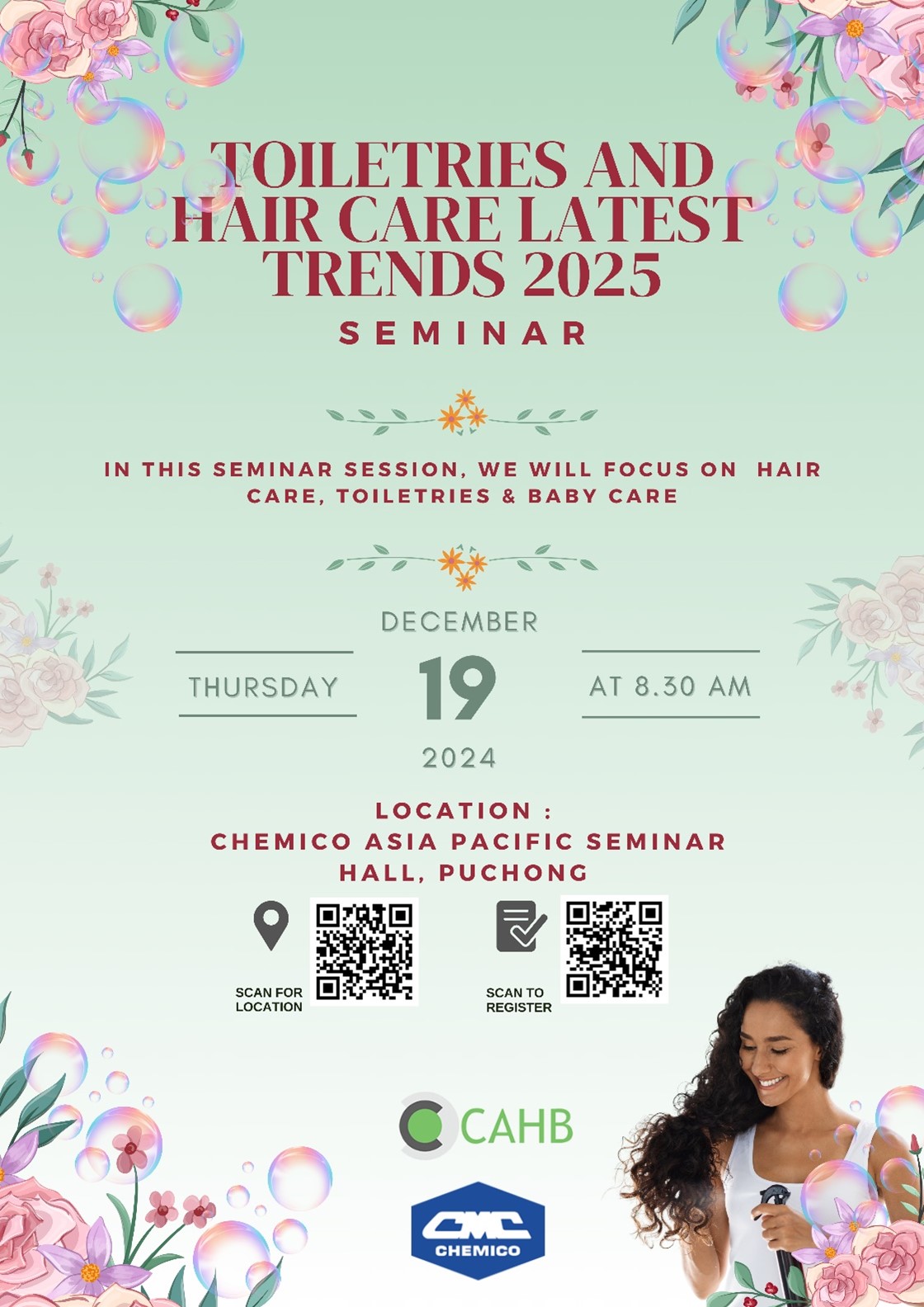 Chemico Asia Pacific (Malaysia) Sdn. Bhd., in collaboration with Chemico Asia Health and Beauty (CAHB) Center, successfully hosted a product seminar on December 19, 2024 at the Chemico Asia Pacific Seminar Room, Malaysia. The seminar aimed to share the latest market trends for toiletries and hair care, transfer new innovative information and product knowledge and build strong customer relationships. Attendees gained valuable insights into market trends and effective product applications. A highlight of the event was the hands-on lab session, where participants had the opportunity to prepare the chosen formulations by themselves and gain a practical experience of the products. The seminar concluded with an engaging Q&A session, leaving attendees inspired and excited to explore the new products.