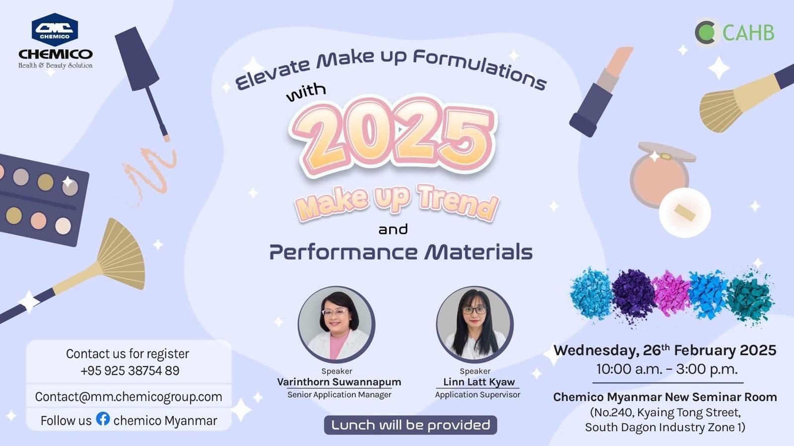 Chemico Myanmar Co., Ltd. in collaboration with Chemico Asia Health and Beauty (CAHB) Center organized a very first seminar of 2025 under the topic “Elevate Make up formulations with 2025 Make up Trend and Performance materials” on February 26th, 2025. The seminar presented on 2025 Make up trend, new formulations and hero ingredients used in the formulations. During the presentation, the prototypes were passed around to the customers for testing product sensory and performance. The set up of all product formulas was also included.