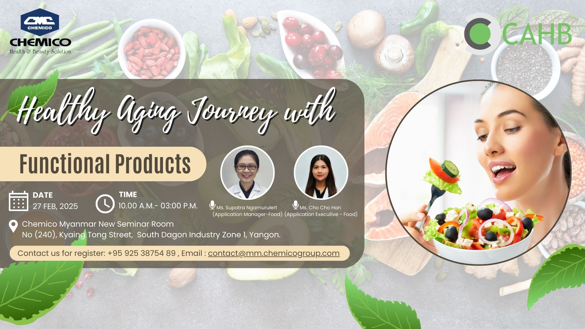 Chemico Myanmar Co., Ltd. in collaboration with Chemico Asia Health and Beauty (CAHB) center organized a seminar entitled “Healthy Aging Journey with Functional Products” on February 27th, 2025 at Chemico Myanmar seminar room. The seminar provided knowledge related to Healthy aging and information on the latest Market trends of Supplement & Functional beverages. During the seminar, the attendees could explore valuable market products and innovative formulations using new ingredients.