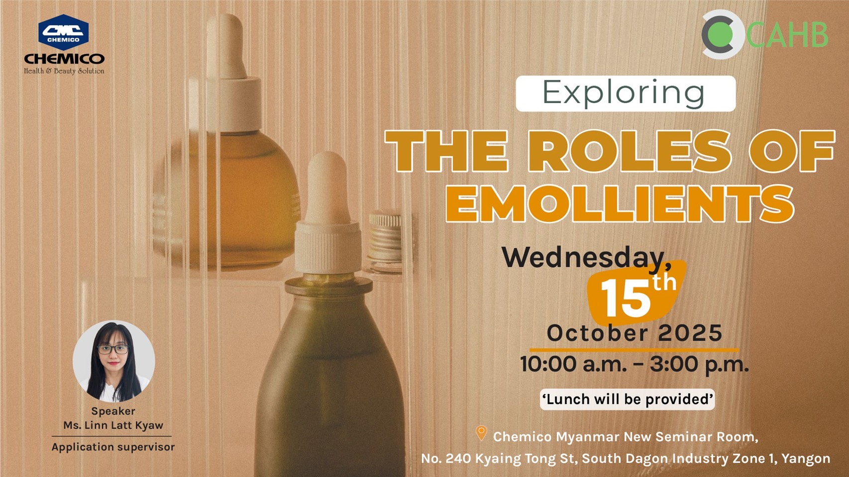 Chemico Myanmar Co., Ltd. organized an interesting Mini-CAHB seminar on October 15th, 2025 under the title "Exploring The Roles of Emollients”. We shared detailed information of emollients and the related formulations. Sensory testing section also included.